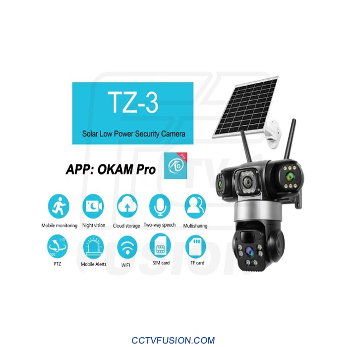 دوربین مداربسته سولار سیمکارتی TZ3 یکی از پیشرفتهترین دوربینهای خورشیدی چهار لنز با قابلیت تعقیب سوژه است. این دوربین با کیفیت تصویر 15 مگاپیکسل واقعی، دو لنز ثابت و یک لنز چرخشی، مناسب محیطهای داخلی و خارجی بدون دسترسی به برق و اینترنت ثابت طراحی شده است. انرژی مورد نیاز آن از پنل خورشیدی و باتری شارژی داخلی تأمین میشود و میتواند تا 24 ساعت برق اضطراری داشته باشد. همچنین با استفاده از سیمکارت 4G و نرمافزار OKAM-PRO تصاویر را بهصورت آنلاین بر روی موبایل نمایش میدهد.